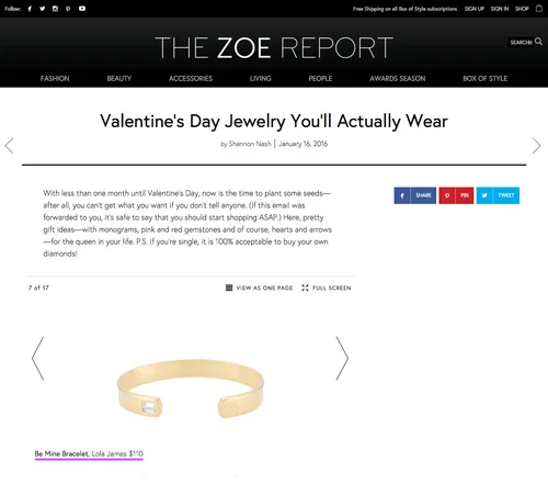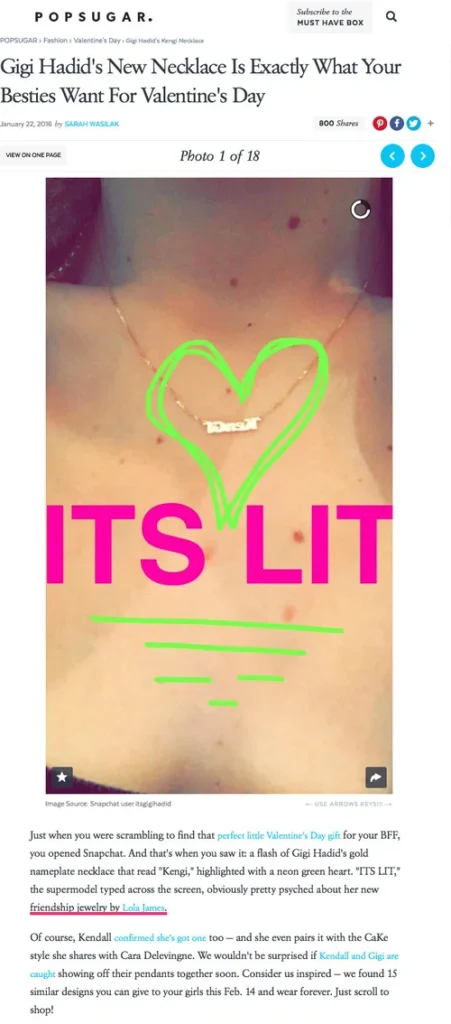 Helena Renee PR was tasked with building buzz around Lola James Jewelry, a brand with modern, timeless, layerable pieces that design wearable jewelry with an attention to quality and detail. HRPR tapped into their network of top stylists, getting Lola James Jewelry worn by A-listers including Blake Lively, Kendall Jenner, Gigi Hadid, Amy Adams, Lucy Hale, Ashley Benson, and more. In addition to organic exposure on the celebrities’ social channels, HRPR crafted compelling storylines to leverage the celebrity sightings and secure features in top tier publications including Vogue, New York Magazine, InStyle, People, Us Weekly, Lucky, Life & Style, Redbook and many others.
